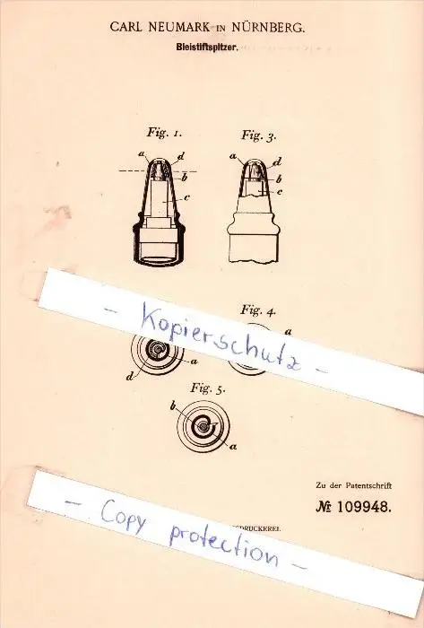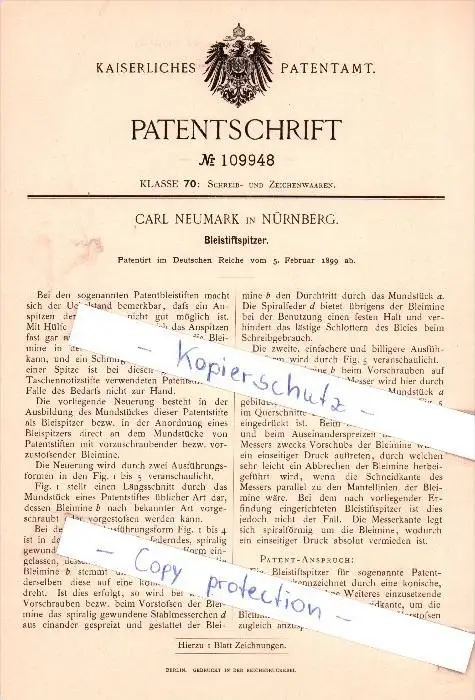 Original Patent - Carl Neumark in Nürnberg , 1899 , Bleistiftspitzer , Bleistift !!!