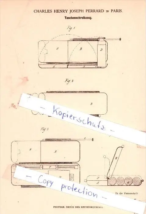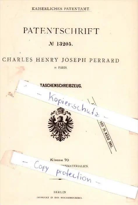 Original Patent - Charles Henry Joseph Perrard in Paris , 1880 , Taschenschreibzeug !!!