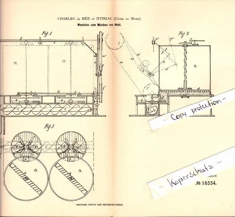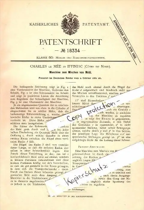 Original Patent - Charles le Mée à Yffiniac , Cotes-d’Armor , 1881 , Machine à mélanger la farine !!!