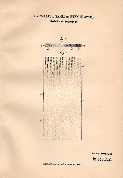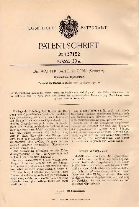Original Patent - Dr. Walter Sahli in Bern , 1901 , Modellierbare Gipsschiene , Gips , Gipsverband , Arzt , Chirurgie !