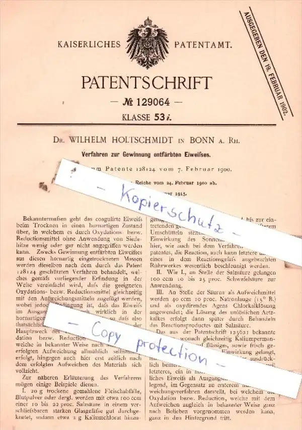 Original Patent - Dr. Wilhelm Holtschmidt in Bonn a. Rh. , 1900 , Gewinnung entfärbten Eiweißes !!!