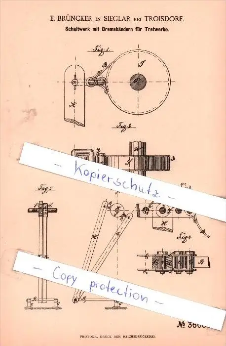 Original Patent - E. Brüncker in Sieglar bei Troisdorf , 1885 , Schaltwerk mit Bremsbändern !!!
