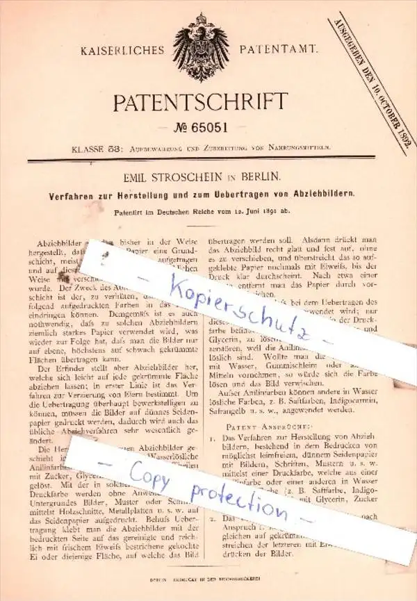 Original Patent - Emil Stroschein in Berlin , 1891 , Uebertragen von Abziehbildern !!!