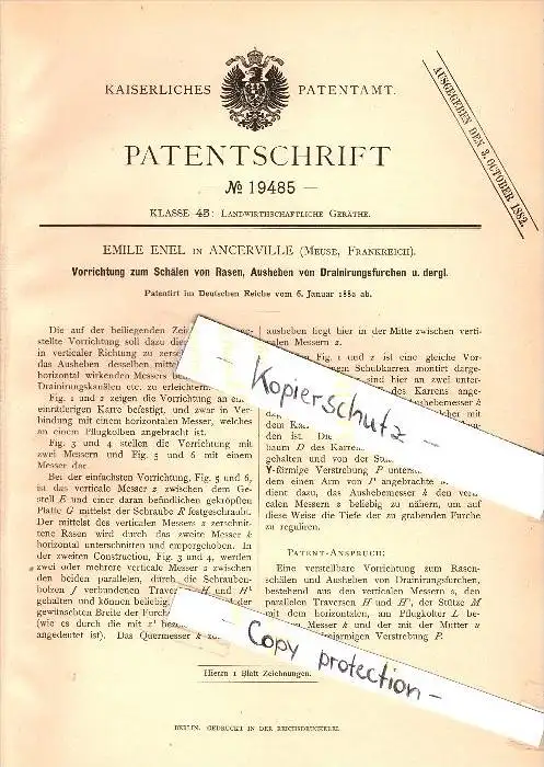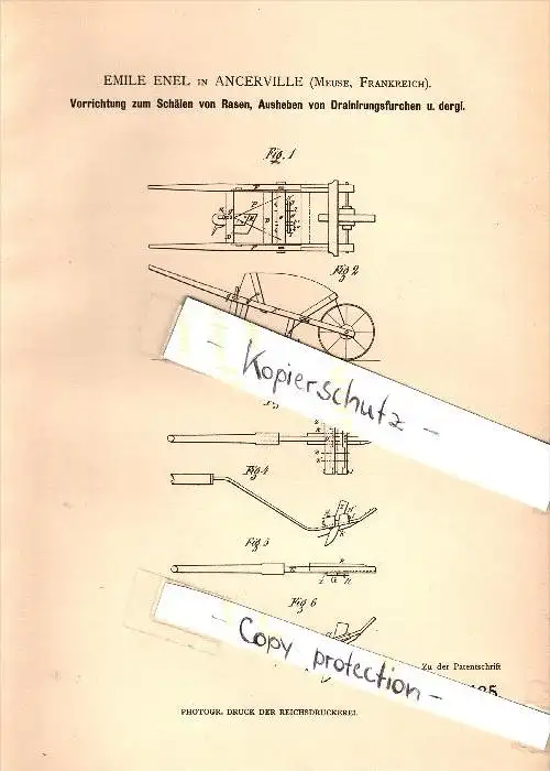 Original Patent - Emile Enel à Ancerville , Meuse , 1882 , Dispositif pour creuser des sillons , agriculture !!!
