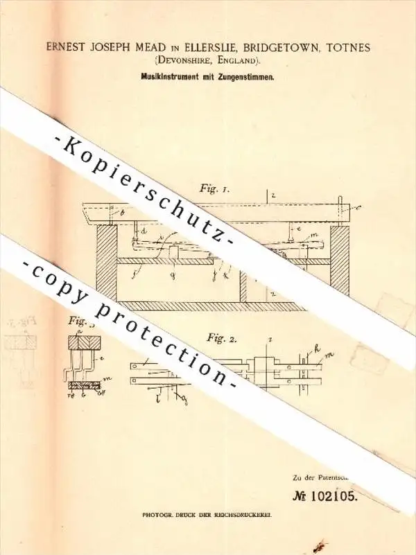 Original Patent - Ernest Mead in Ellerslie , Totnes , 1897 , musical instrument , Devon !!!