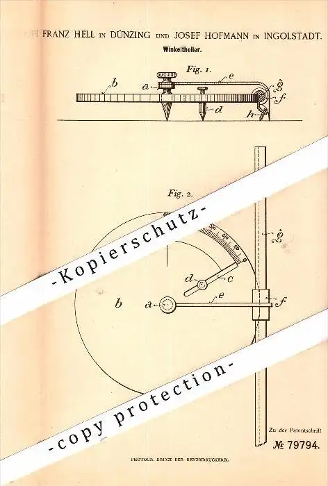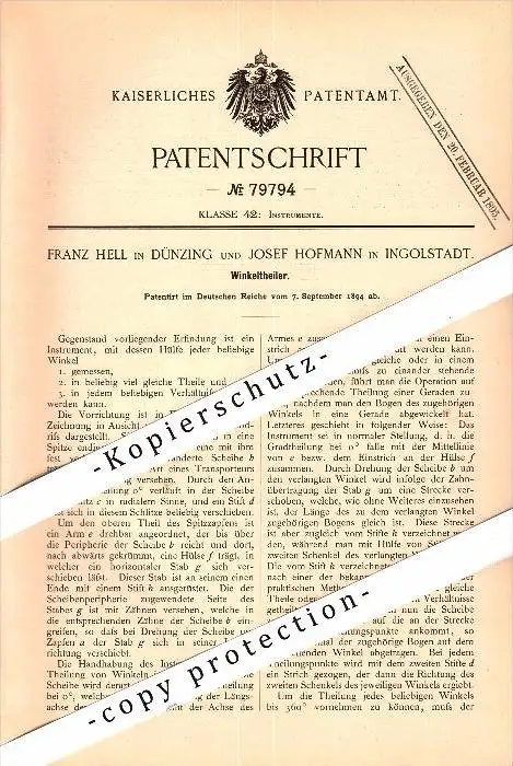 Original Patent - F. Hell und J. Hofmann in Dünzing / Vohburg a.d. Donau und Ingolstadt ,1894, Winkelteiler , Geometrie