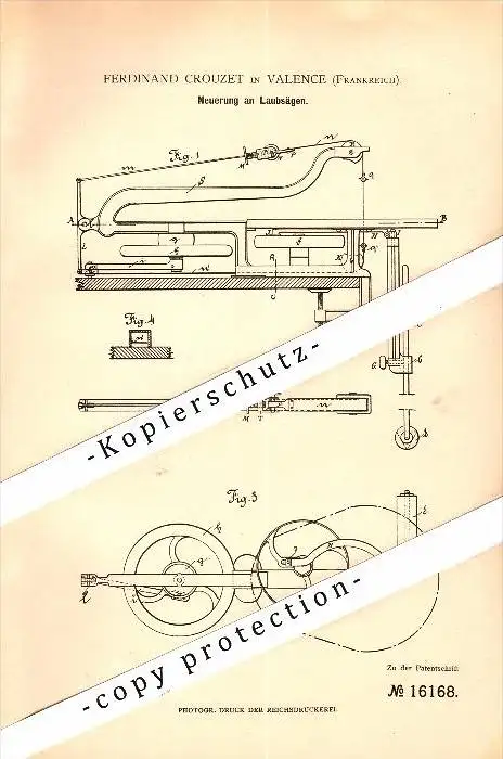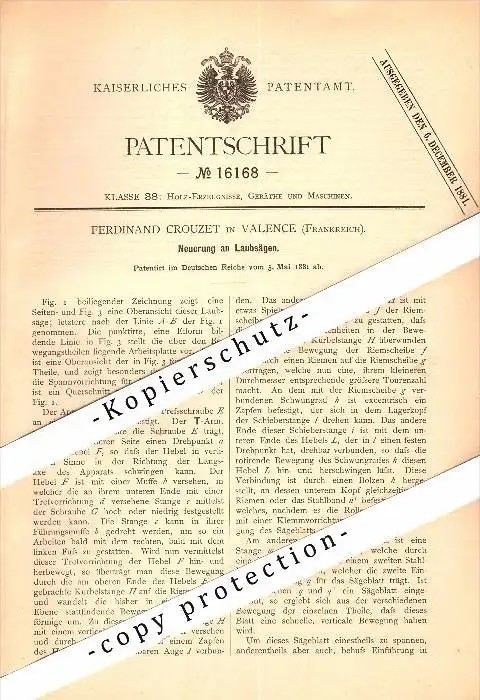 Original Patent - Ferdinand Crouzet à Valence , 1881 , Scie pour le bois !!!