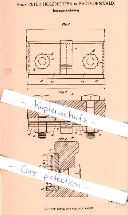 Original Patent - Firma Peter Holzrichter in Radevormwald , 1901 , Schraubensicherung !!!