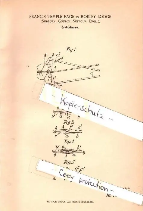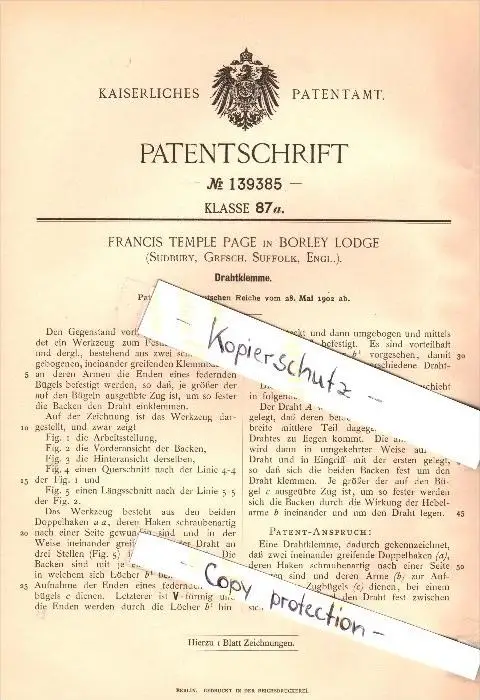 Original Patent - Francis Temple Page in Borley Lodge , Sudbury , 1902 , Tool for wire , Borley Rectory !!!