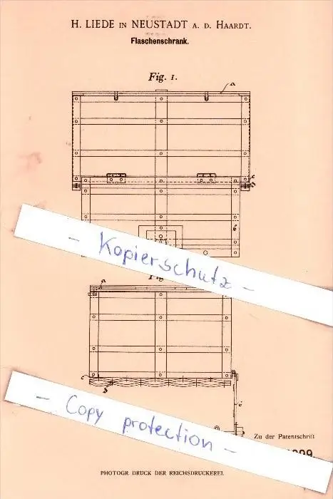 Original Patent - H. Liede in Neustadt a. d. Haardt , 1899 , Flaschenschrank !!!