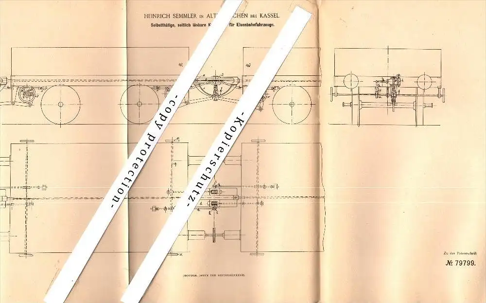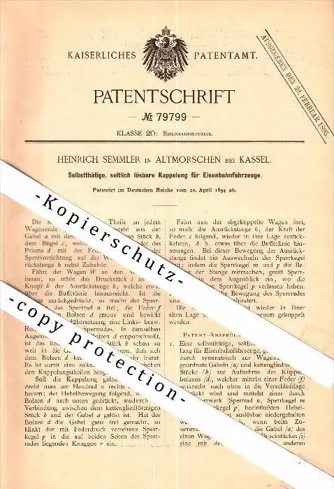 Original Patent - Heinrich Semmler in Altmorschen b. Morschen , 1894 , Kupplung für Eisenbahn , Kassel !!!