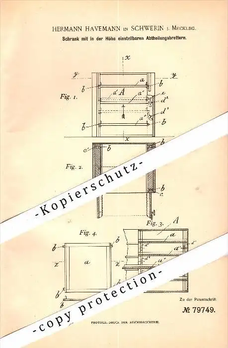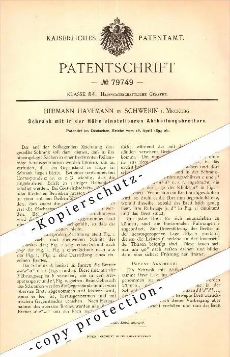 Original Patent - Hermann Havemann in Schwerin i. Mecklenburg , 1894 , Schrank mit Abteilungsbrettern , Möbel !!!