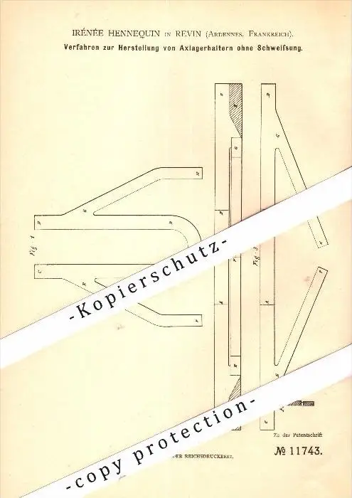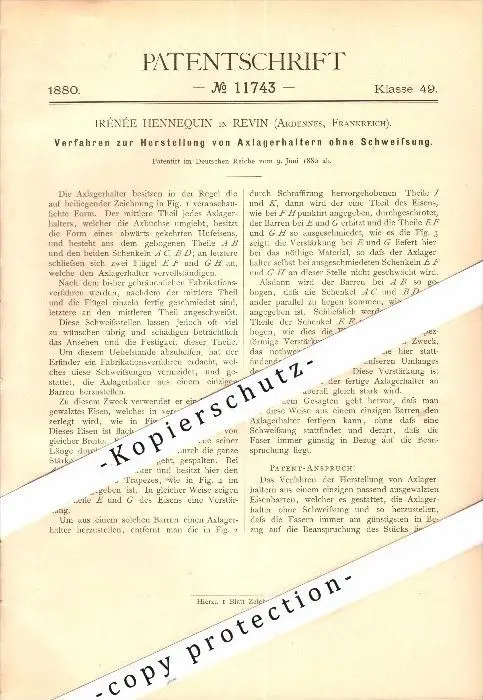 Original Patent - Irénée Hennequin à Revin , Ardennes , 1880 , Production de paliers d'essieu sans soudure !!!