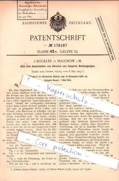 Original Patent - J. Böckler in Malchow i. Mecklenburg , 1905 , Sieb zum Ausscheiden von Körnern !!!