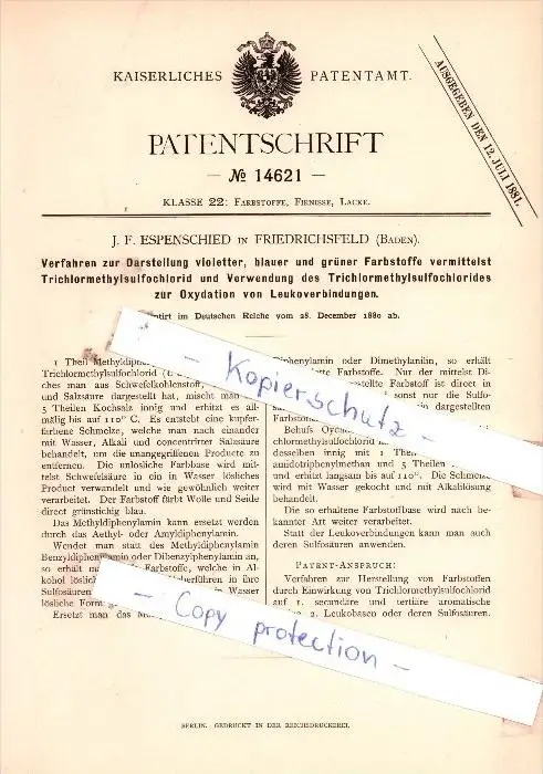 Original Patent - J. F. Espenschied in Friedrichsfeld , Baden , 1880 , Farbstoffe, Firnisse, Lacke !!!