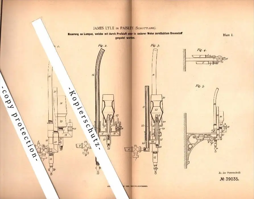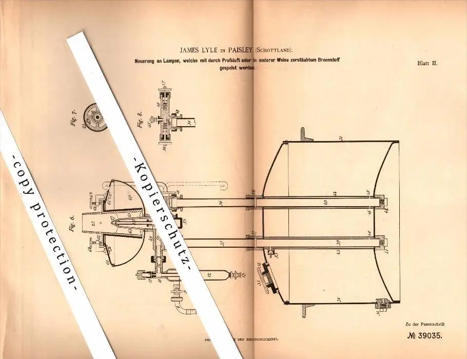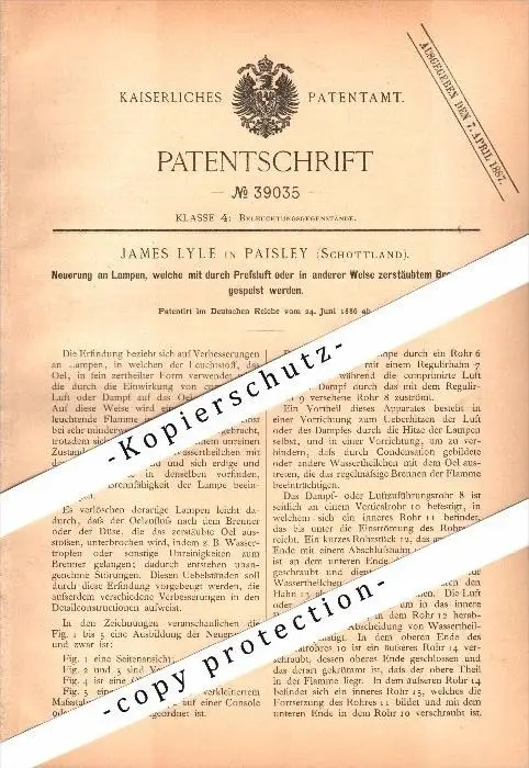 Original Patent - James Lyle in Paisley , Scotland , 1886 , Lamps with atomized fuel !!!
