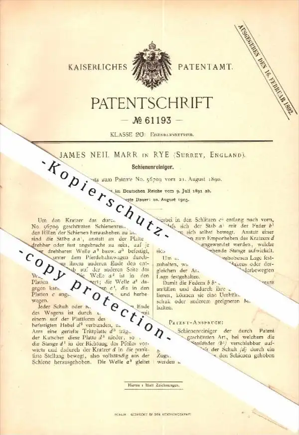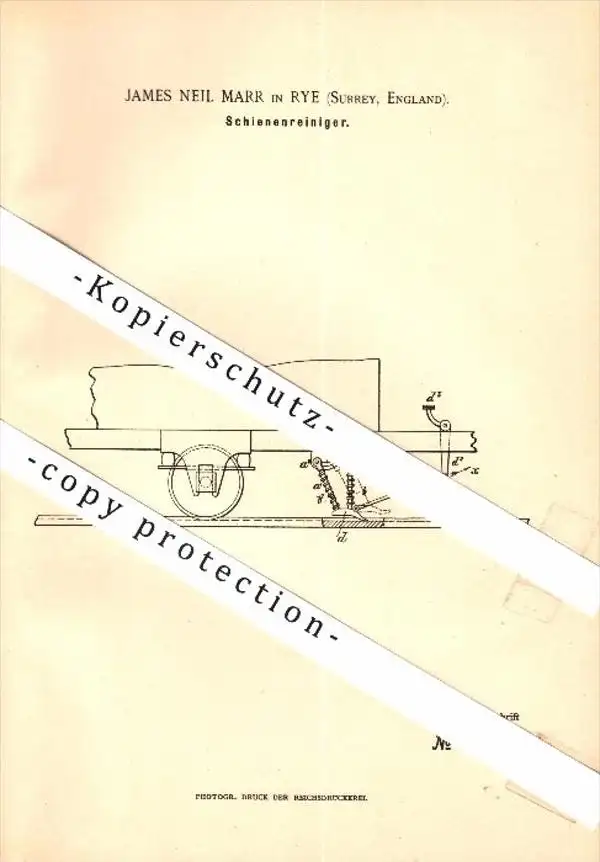 Original Patent - James Neil Marr in Rye , England , 1891 , Cleaner for rails , train !!!