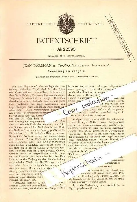 Original Patent - Jean Darrigan à Cagnotte , Landes , 1882 , Innovation de briques , tuile !!!