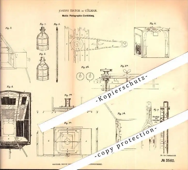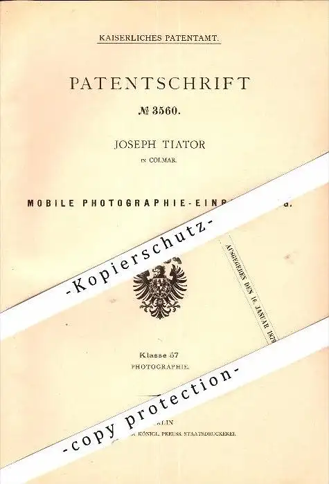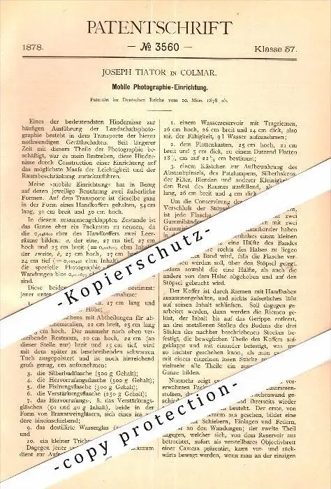 Original Patent - Joseph Tiator à Colmar , Elsass , 1878 , Photographie Mobile - Caméra !!!