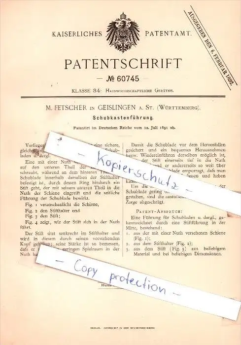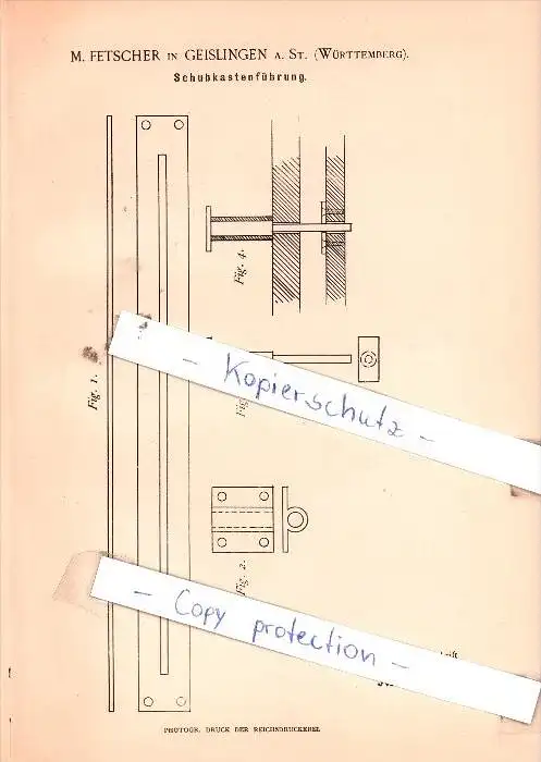 Original Patent - M. Fetscher in Geislingen a. St. , Württemberg , 1891 , Schubkastenführung !!!