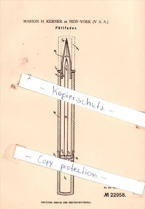 Original Patent - Marion H. Kerner in New-York , USA , 1882 , Federhalter , Füllfederhalter !!!