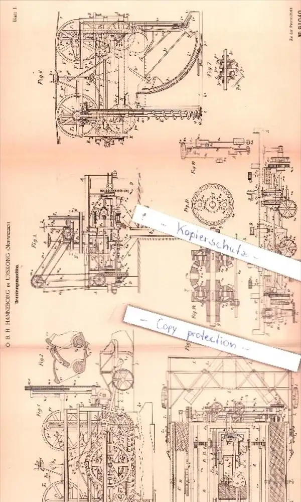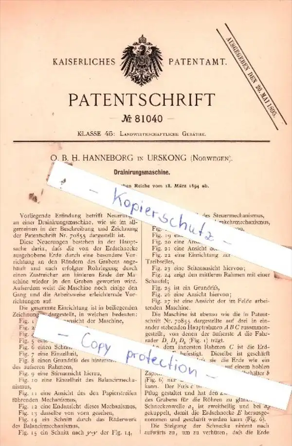 Original Patent - O. B. H. Hanneborg in Urskong , Norwegen , 1894 ,Drainierungsmaschine !!!