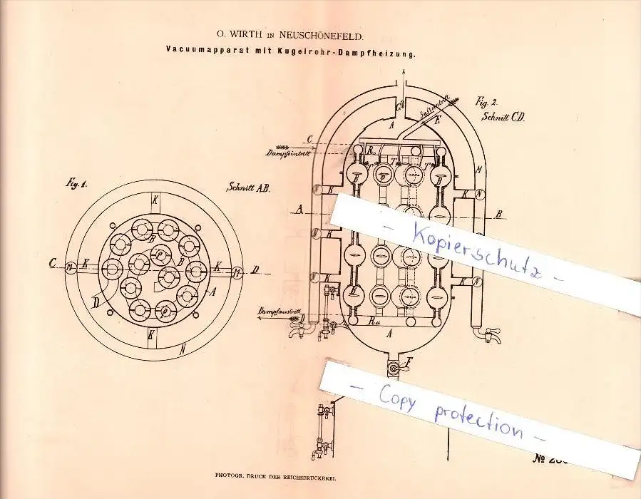 Original Patent - O. Wirth in Neuschönefeld b. Leipzig , 1883 , Vacuumapparat mit Kugelrohr-Dampfheizung !!!