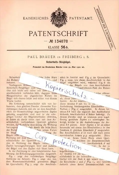 Original Patent - Paul Bräuer in Freiberg i. S. , 1901 , Sicherheits - Steigbügel , Pferde , Reiter !!!