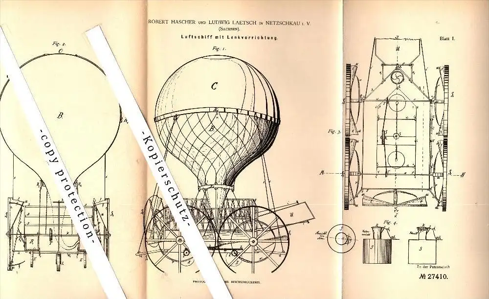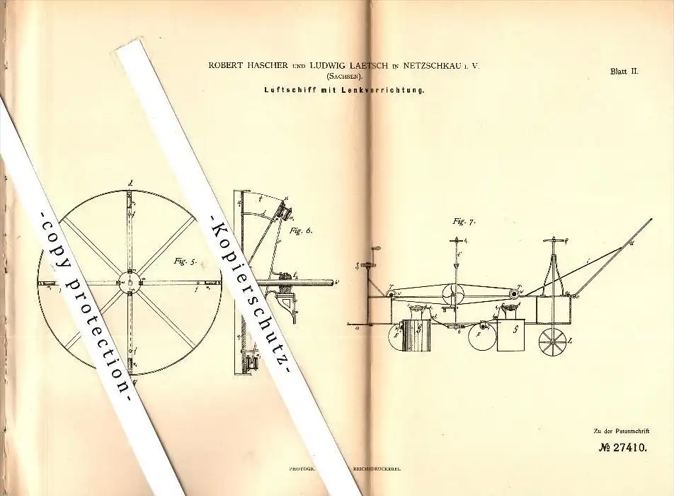 Original Patent - R. Hascher und L. Laetsch in Netzschkau i.V. , 1883 , Luftschiff mit Lenkung , Ballon , Flugapparat !!