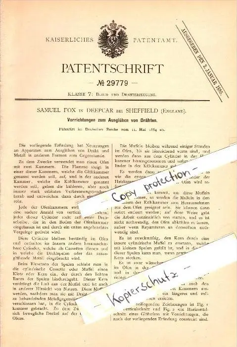 Original Patent - Samuel Fox in Deepcar b. Sheffield , 1884 , Machine for annealing wire !!!