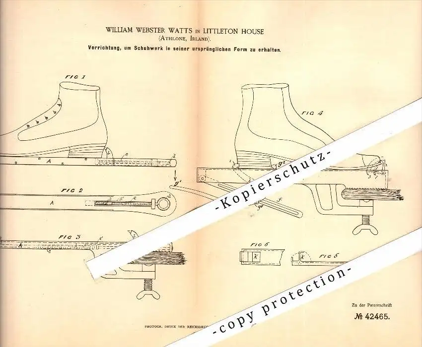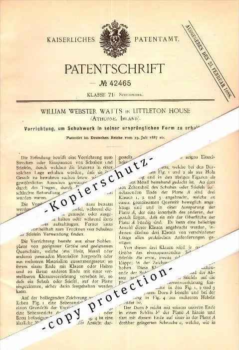Original Patent - William Watts in Littleton House , Athlone , 1887 , Tensioning device for shoes , Ireland !!!