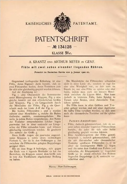 Original Patentschrift - A. Krantz und A. Meyer in Genf , 1902 , Flöte , Flöten , Musik , Blasinstrument !!!