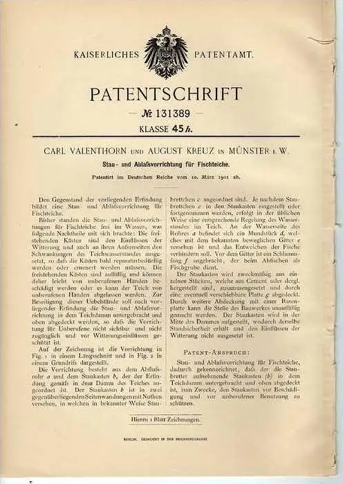 Original Patentschrift - A. Kreuz in Münster i.W. ,1901 , Fischteich Stauanlage , Fisch , Angeln , Fischzucht !!!