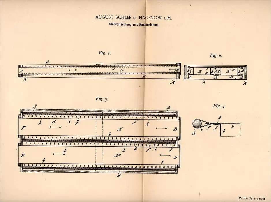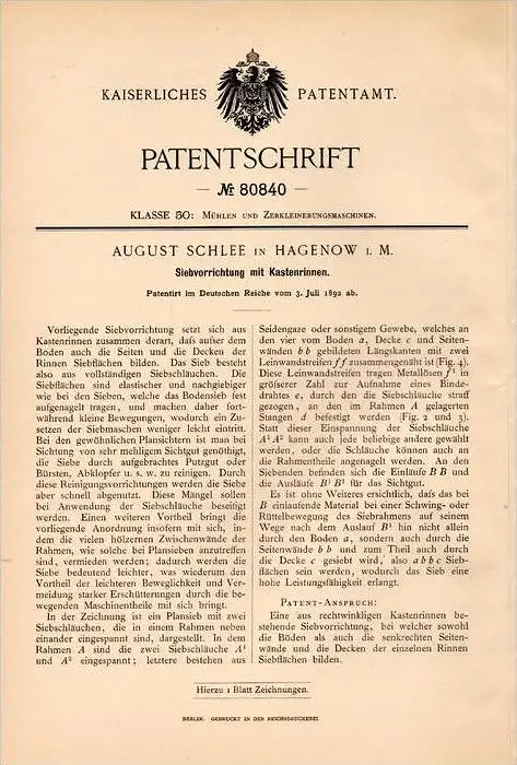 Original Patentschrift - A. Schlee in Hagenow i. Meckl. , 1892 , Sieb mit Kastenrinne , Mühle , Müller !!!