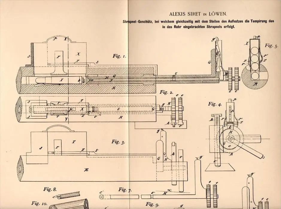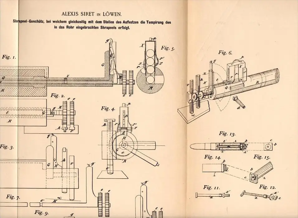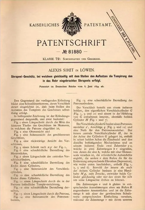 Original Patentschrift - A. Siret in Löwen , 1894 , Kanone , Geschütz , Waffe !!!