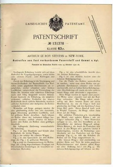 Original Patentschrift - A. Stevens in New York ,1900 , Reifen , Radreifen !!!