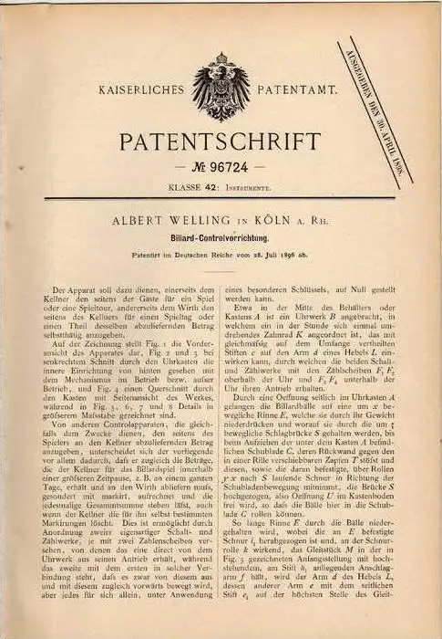 Original Patentschrift - A. Weling in Köln a. Rh., 1896 , Billiard Controllvorrichtung !!!