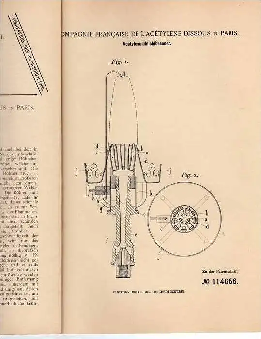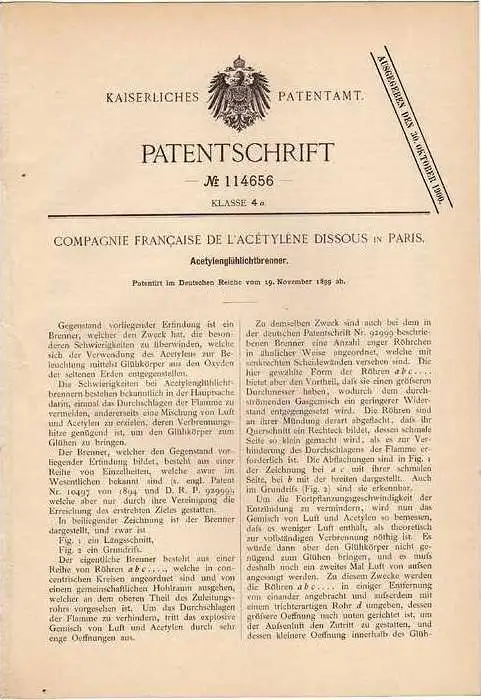 Original Patentschrift - Acetylen Glühlichtbrenner , Gaslampe , 1899, Comp. de L`Acetylene in Paris !!!