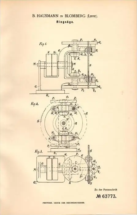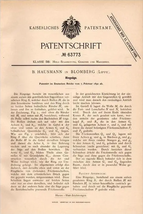 Original Patentschrift - B. Hausmann in Blomberg / Lippe , 1892 , Ringsäge , Sägewerk , Tischlerei , Holz , Forst !!!
