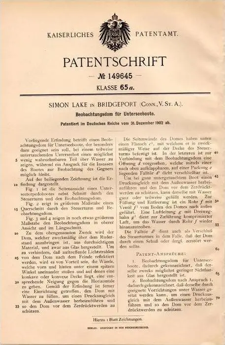 Original Patentschrift - Beobachtungsdom für Unterseeboot , U-Boot , 1902 , S. Lake in Bridgeport , USA !!!