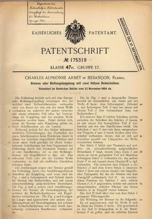 Original Patentschrift - C. Arbey in Besancon , 1904 , Bremse oder Kupplung mit Reibscheiben !!!