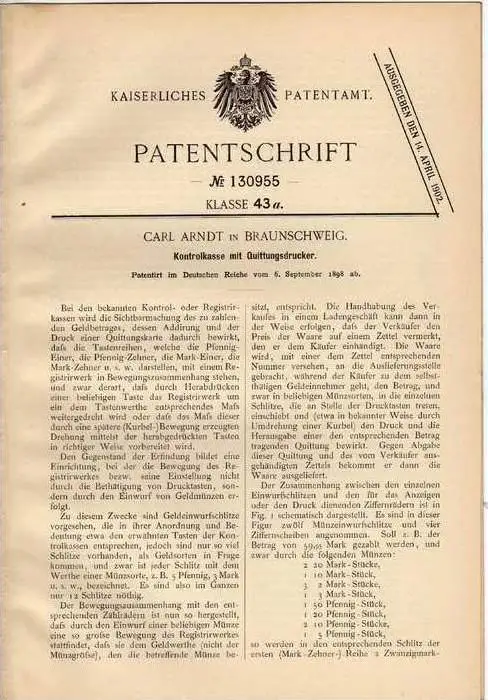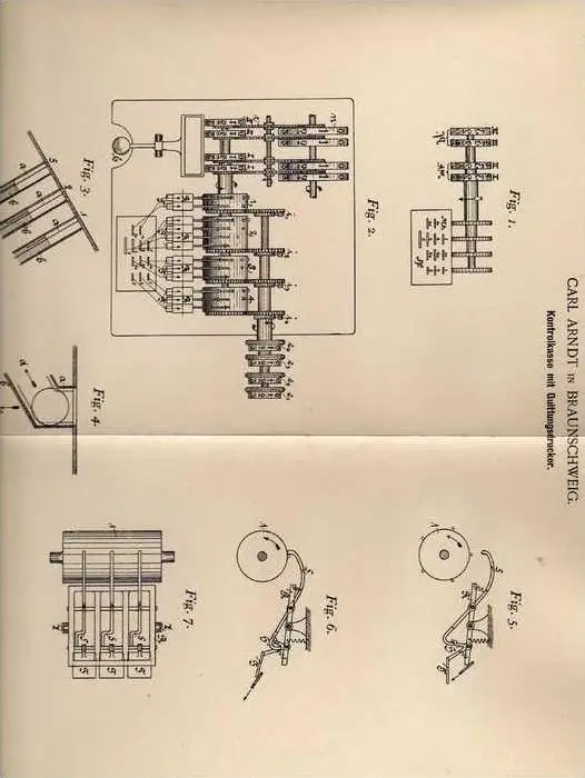 Original Patentschrift - C. Arndt in Braunschweig , 1898 , Kontrollkasse mit Quittungsdrucker , Kasse , Registrierkasse