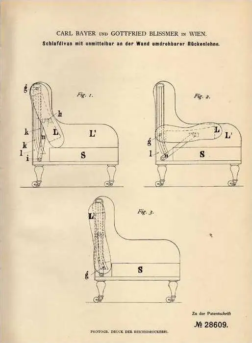 Original Patentschrift - C. Bayer in Wien , 1883 , Schlafdivan , Sessel , Liege !!!
