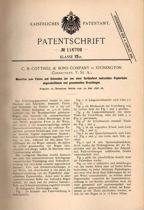 Original Patentschrift - C. Cottrell & Sons in Stonington , 1898 , machine for cutting paper !!!