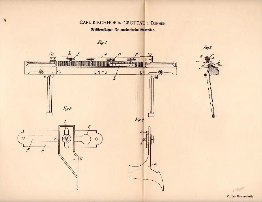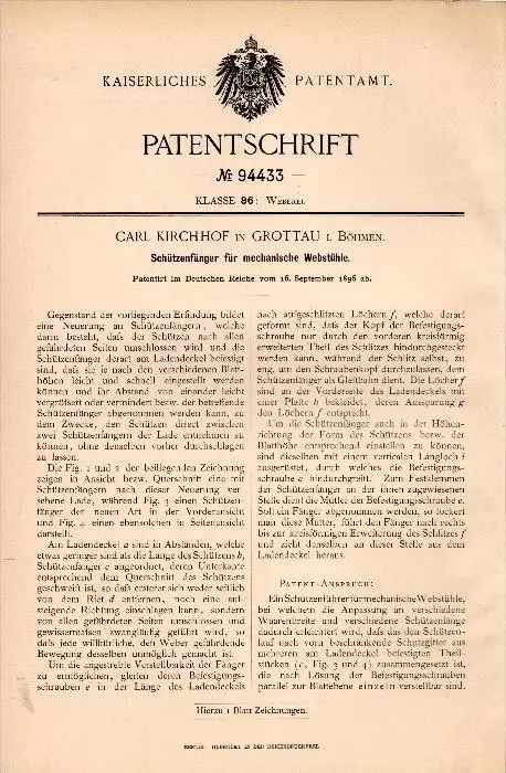 Original Patentschrift - C. Kirchhof in Grottau / Hrádek nad Nisou , 1896 , Apparat für Webstuhl , Weberei , Weber !!!