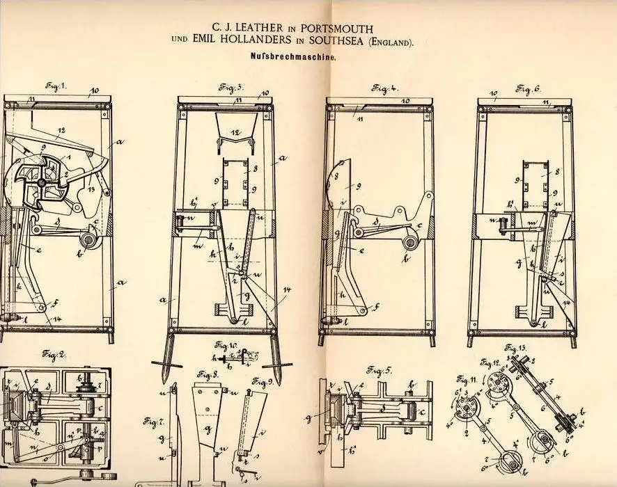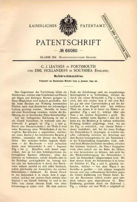 Original Patentschrift - C. Leather und E. Hollanders in Southsea , 1892 , machine for breaking nuts , nut , cores !!!