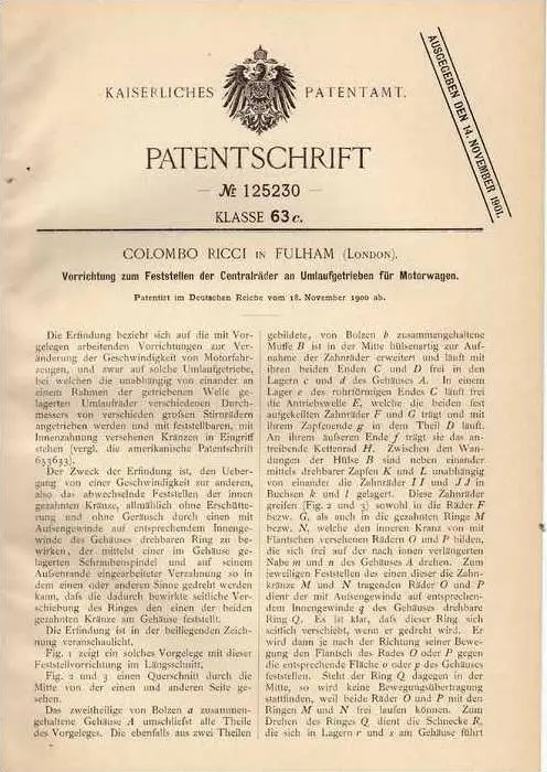 Original Patentschrift - C. Ricci in Fulham , 1900 , Getriebe für Motorwagen , Automobile !!!