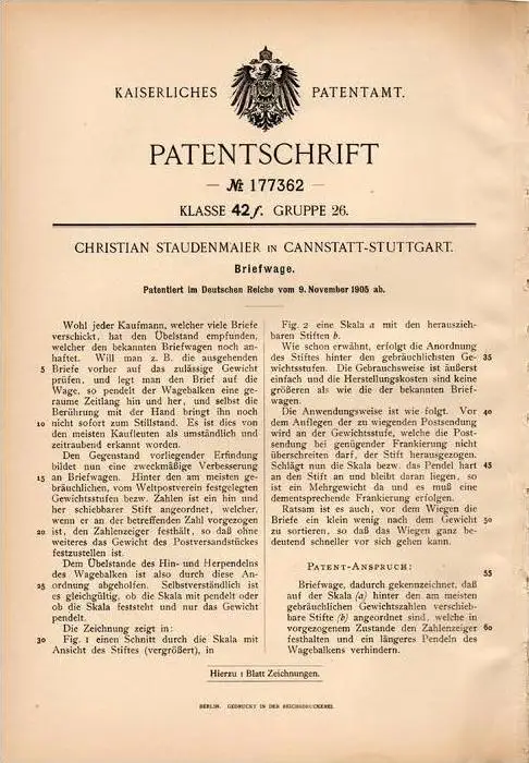 Original Patentschrift - C. Staudenmaier in Cannstadt - Stuttgart , 1905 , Briefwaage , Waage !!!