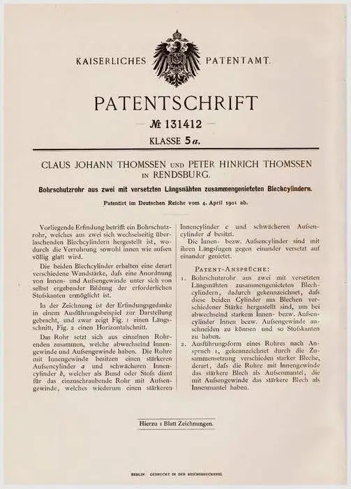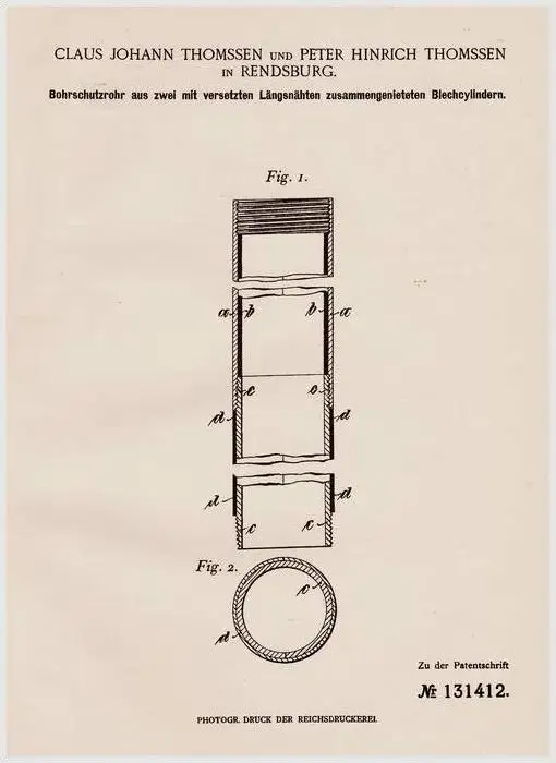 Original Patentschrift - C. Thomssen in Rendsburg , 1901 , Bohrschutzrohr mit Blechcylinder !!!