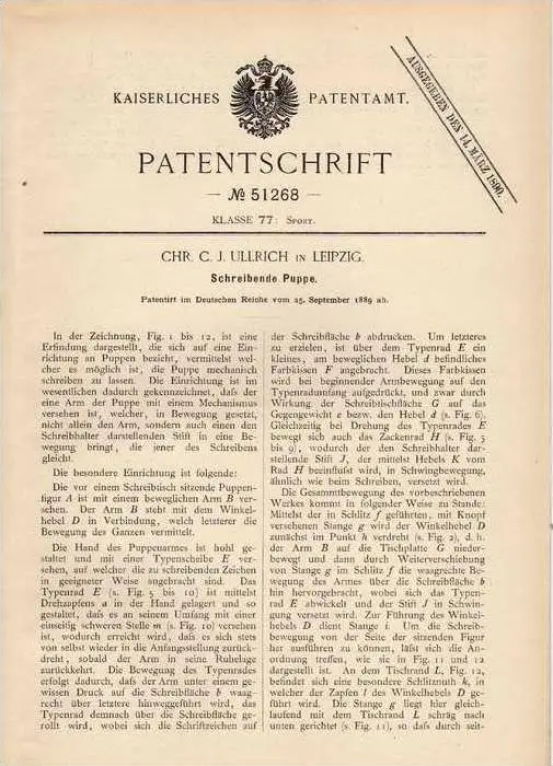 Original Patentschrift - C. Ullrich in Leipzig , 1889 , schreibende Puppe !!!